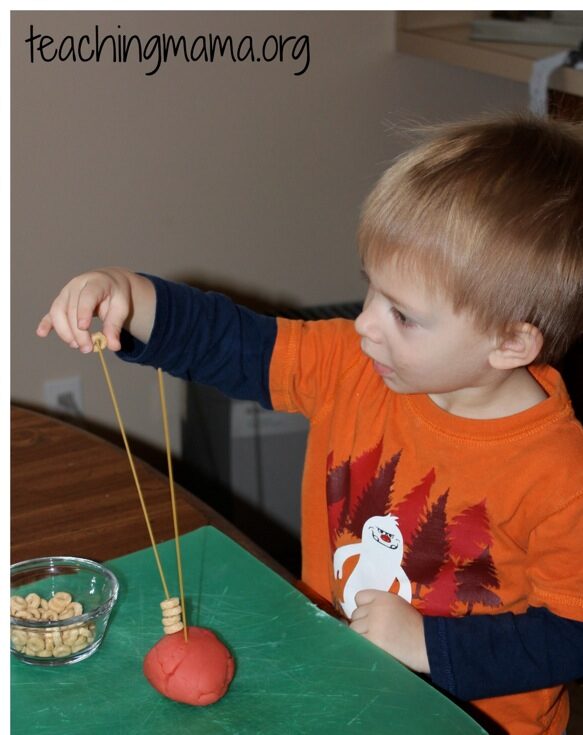 My kids love this activity. Just take some play dough, roll it in a ball, then stick spaghetti noodles on the top. Have your toddler slide cheerios down the noodle. It’s simple, but great for practicing fine motor skills! And it really keeps them busy.