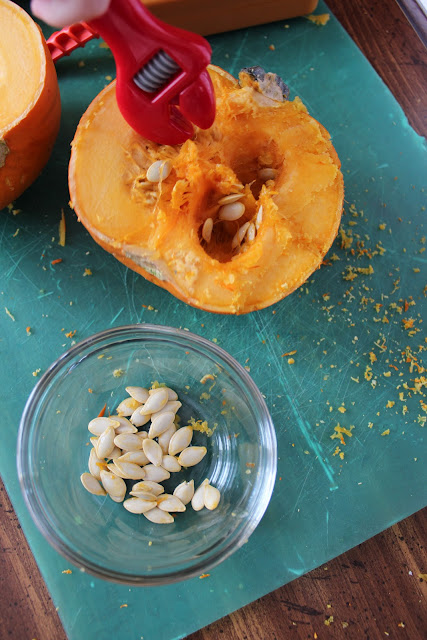After getting all the seeds out, I roasted them. I also made pumpkin puree out of the pumpkin flesh and made pumpkin pancakes later! Yum!