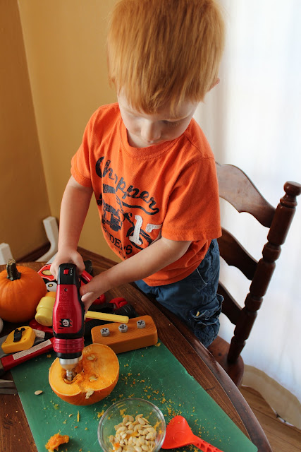 Troy spent about an hour “drilling” and using his other tools on the pumpkin. It was a fun activity and Troy really used his imagination.