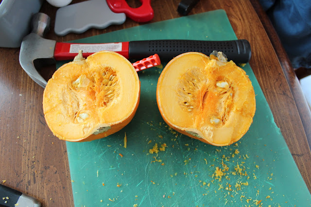 We thought it would be easy to cut open a little pumpkin….WRONG! I started using a knife and these pumpkin carving tools. I got these for like 30 cents last year after Halloween last year at Target. So, after the knife didn’t really work, I used a hammer, screwdriver, and eventually a saw! It was one tough pumpkin. And Troy used his tools as well 🙂