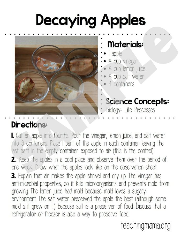 Now those may sound really scientific, but I promise we are doing simple (and cool!) science activities. Here’s one of my favorite activities from the packet. We watched how apples decay. Air was the constant and then we soaked apple slices in vinegar, salt water, and lemon juice. We observed them for a week and it was fun to see the results!