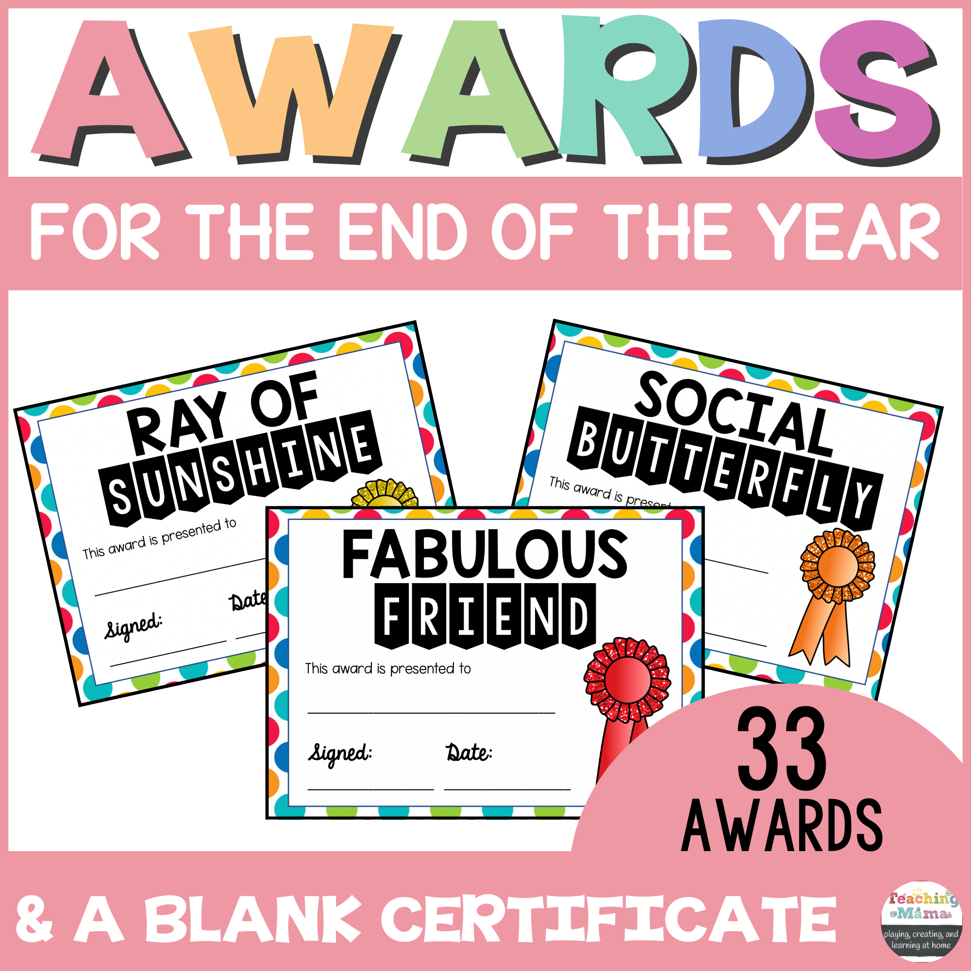 This printable has 35 awards for a variety of skills. Some are academic and others are based on personalities. I tried to come up with a variety of awards, but if you’d like to come up with your own, you can! I left the last page blank and put in editable fields, so you can type in your own text.