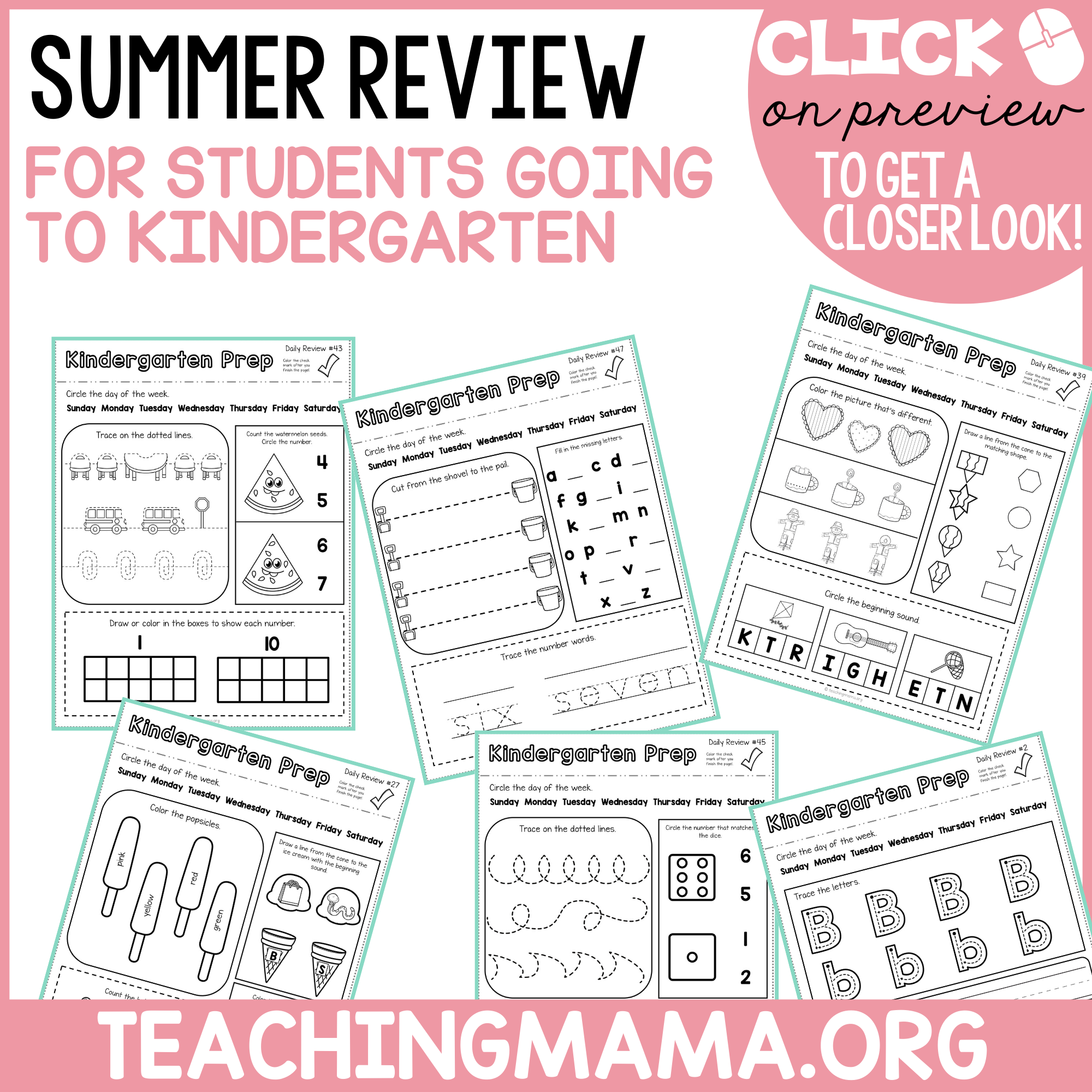 This packet will provide your students plenty of review with the alphabet, numbers, patterns, tracing, writing, rhyming and more!