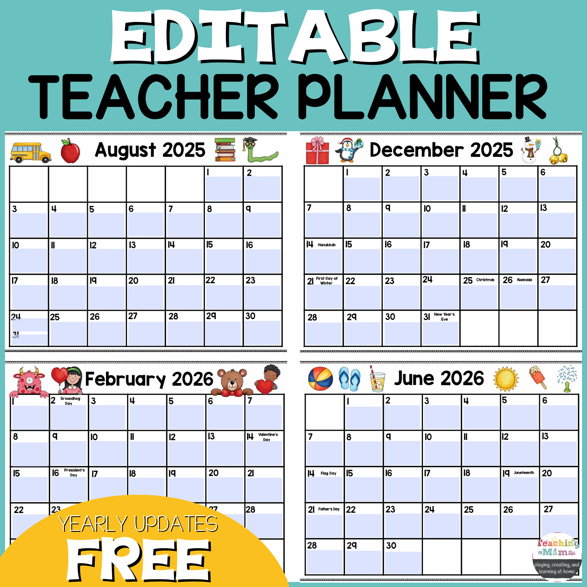You will also receive the updated version of the calendar every year!! Let’s make lesson planning fun and easy with this editable teacher planner!