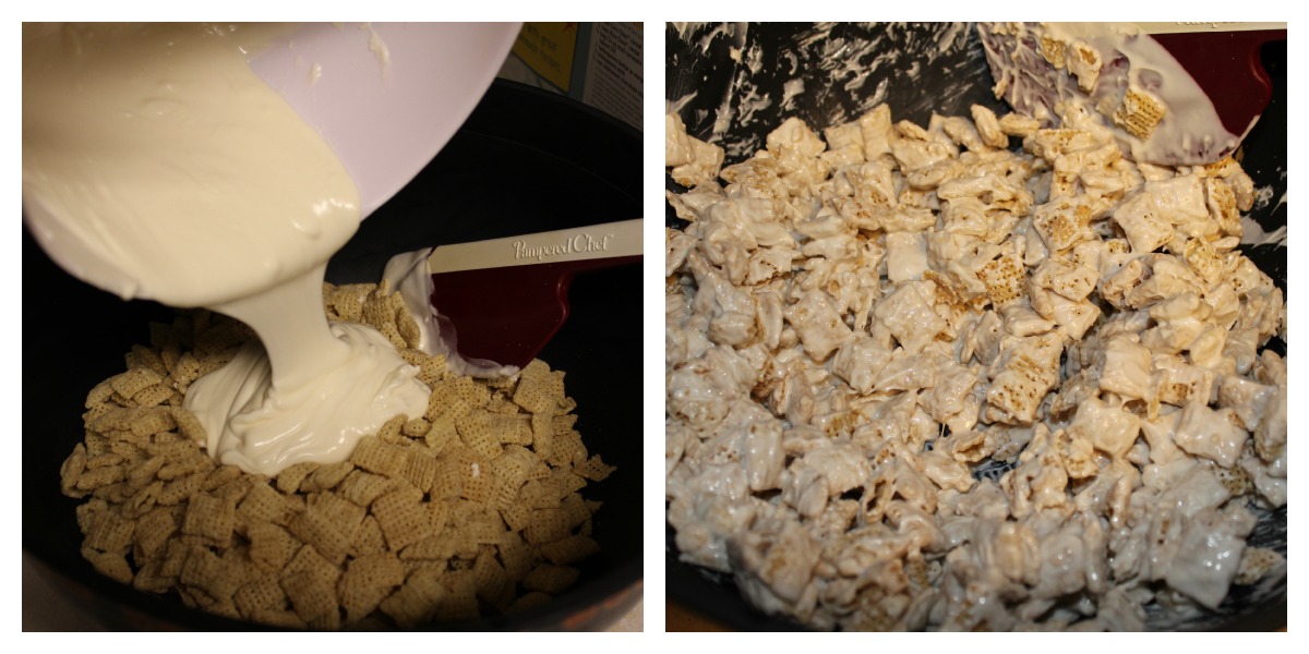 First, put the Almond Bark into a microwavable container and microwave for 90 seconds. Take it out and stir it. Then put it back in for 15 seconds, stir it and repeat until it is fully melted. Then, pour almond bark over 8-9 cups of Rice Chex. Mix well.